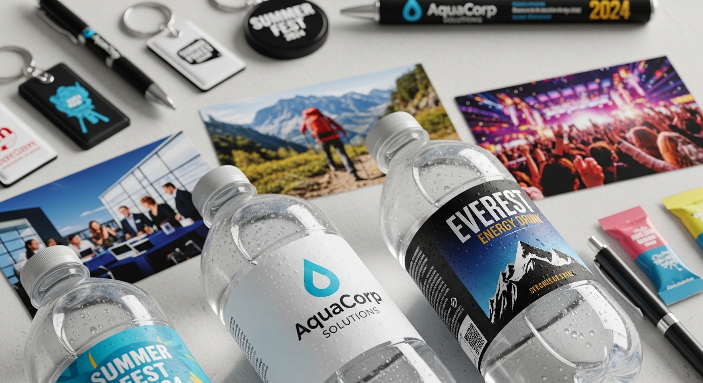 お客様の企業ロゴやキャッチコピーをデザインしたオリジナルラベルを制作し、ミネラルウォーターのボトルに貼付いたします。来場者に配布することで、さりげなくブランド認知を高める効果があります。ラベルデザインは完全カスタム対応で、色やフォント、ロゴ配置など、細部までお客様のご要望に合わせて仕上げます。